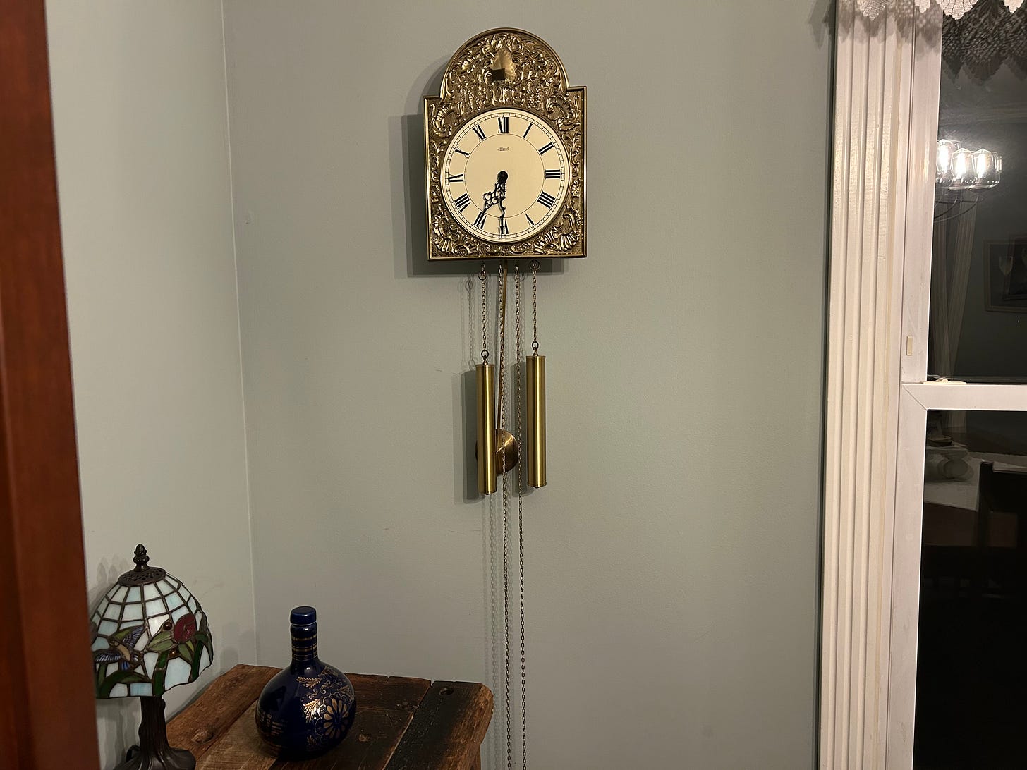 The Black Forest is not only known for Grimm fairy tales like Hansel and Gretel but also for its clock making. So, apparently my mother in law had an old Hermle clock and even though it is gaudy looking, I decided to hang it up in my dining room. I kinda like it there.