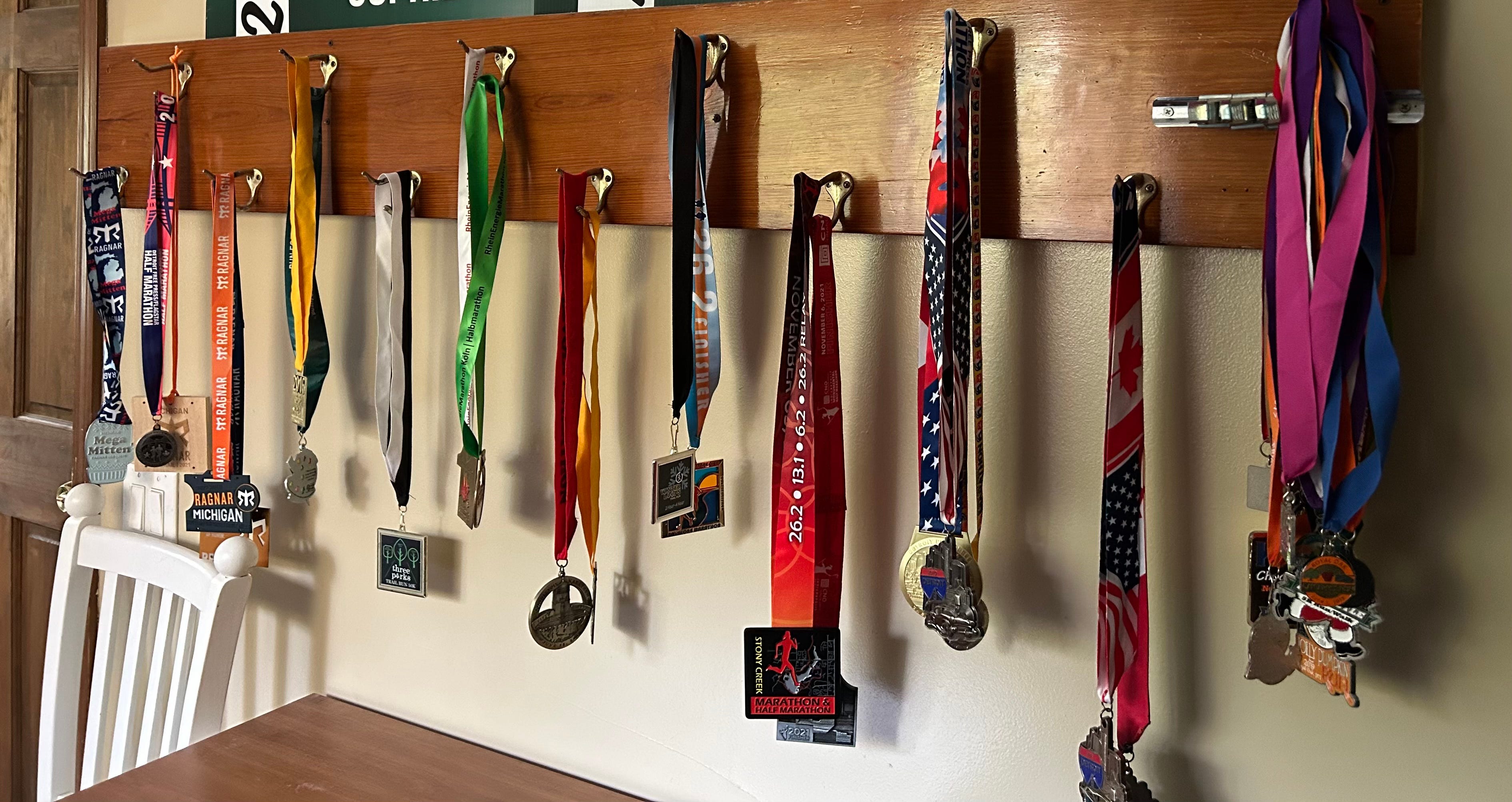 Here they are; all the marathons, ultras, and halfs I have ever run are on the left. The pile on the furthest right hook is just random 5ks and 10ks. Yes, I am bragging. But this was hard work. And I did this by myself. Running used to be easy. An escape point. Since I am in a better relationship, I do not feel like running away as often as with my ex and the covid panic really ruined a lot of racing, so I have not done much running lately.